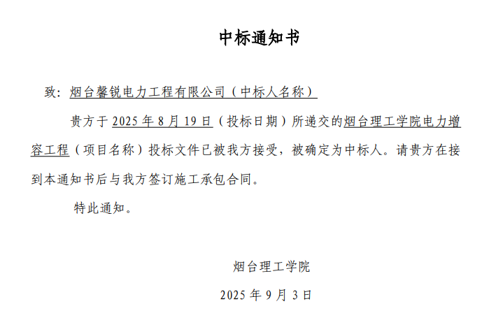 9月3日,随着电力增容工程中标通知书的正式发出,烟台理工学院宿舍空调安装项目正式拉开帷幕。