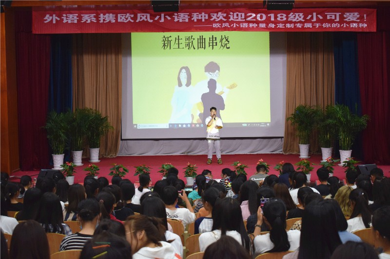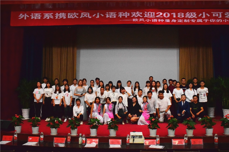 青春风采,外语飞扬。9月14日晚,外国语言文学系“心语新愿,执梦远航”迎新晚会于一教多功能厅顺利举行,并圆满落下帷幕。外语系党支部书记张廷国教授,团总支书记温少斐老师欧风小语种市场总监吴越老师,辅导员卜小凡老师18级新生班主任卢洁芳老师出席了此次晚会,2018级全体新生到场观看了精彩绝伦的晚会。