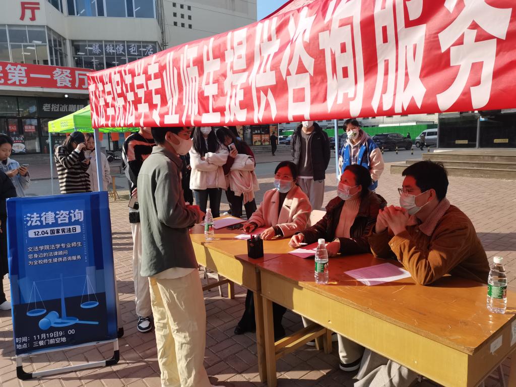 在“12.4”第九个国家宪法日来临之际,文法学院以兼职律师、仲裁员为主的法学专业师资队伍和普法协会法学学生于11月19日上午在校园三餐门前面向全校师生举办了“与宪同行”为主题的法律咨询服务活动。