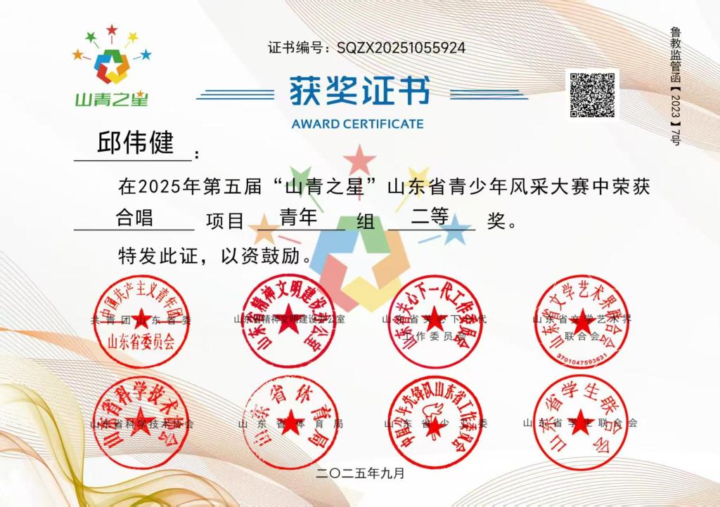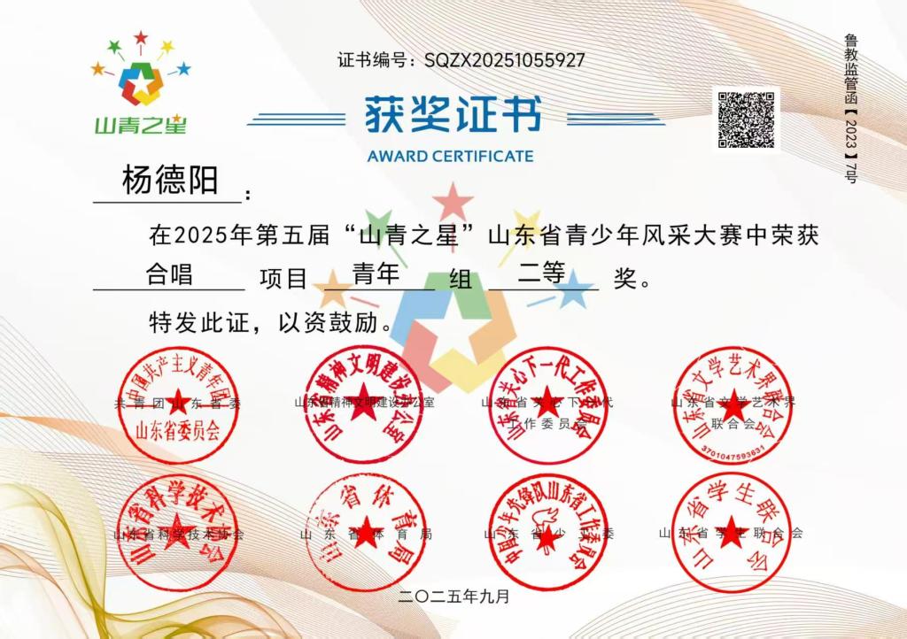 2025年第五届“山青之星”山东省青少年风采大赛于近日落下帷幕,我校公共艺术教育中心选送的多个节目在赛事中表现亮眼,斩获一等奖、二等奖及多个优秀奖,充分展现了学校在美育教学及实践方面的卓越成果。