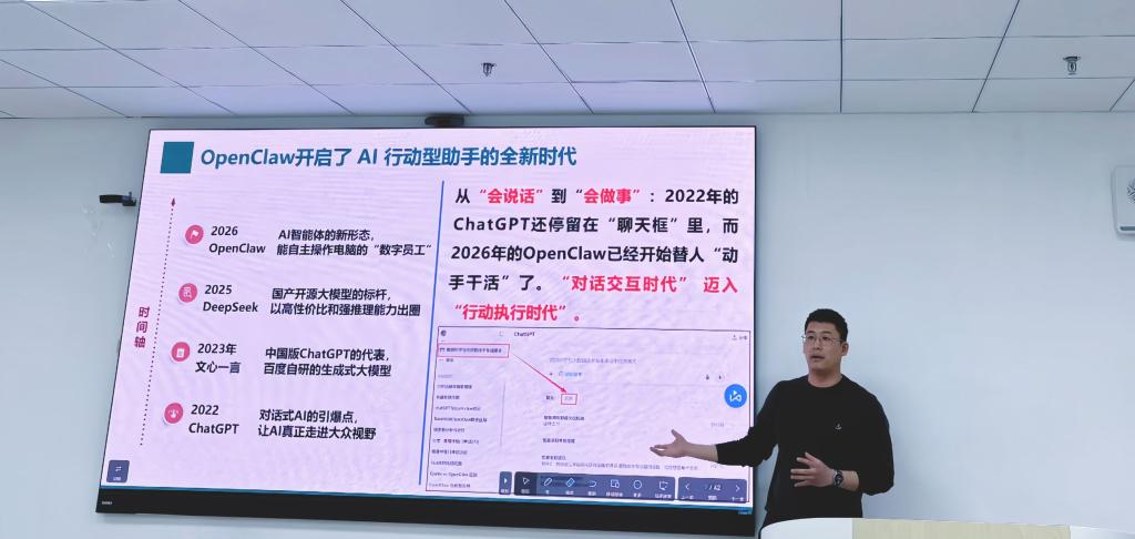 3月20日下午,人工智能学院教师孔德昱作了题为《让AI进入课堂:OpenClaw工作原理、部署实践与教学应用探索》的专题汇报。汇报围绕OpenClaw的核心理念、技术架构、部署方式、典型应用以及教育教学场景中的实践探索展开,内容前沿、案例丰富,具有较强的启发性和实践价值。